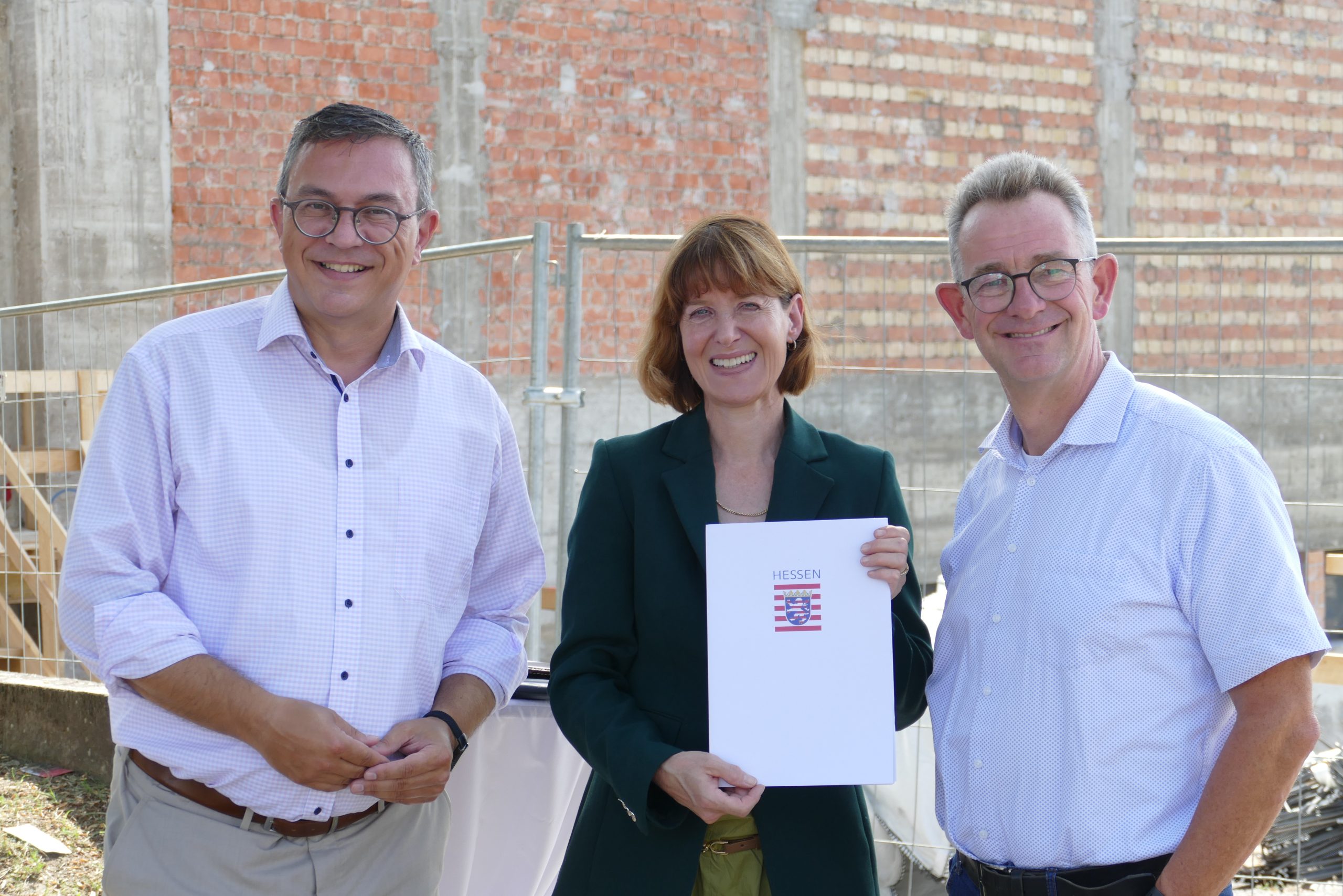 Staatsminister Kaweh Mansoori hat einen Förderbescheid über 3,3 Mio. Euro an Bürgermeister Christian Schönung übergeben. Mit dabei waren auch Mitarbeitende der Stadtverwaltung Lorsch und …