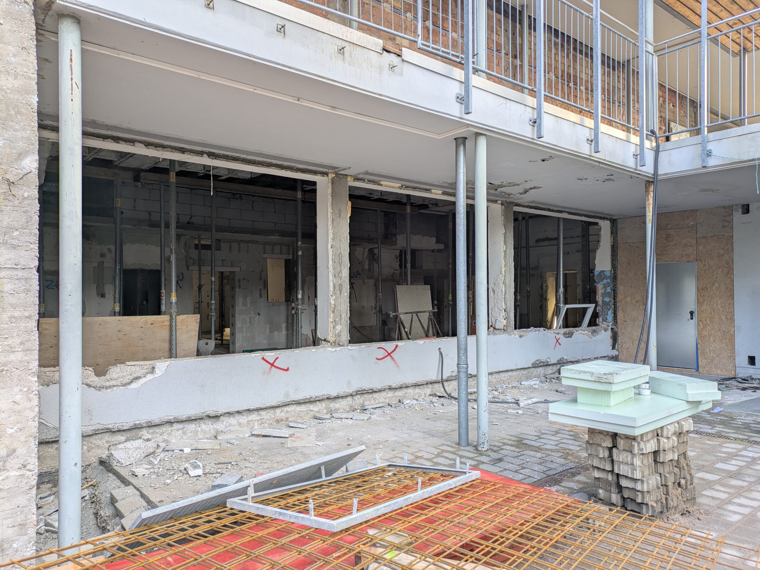 - Kernsanierung und Umbau Innenraum, Eingriff in tragende Bauteile, barrierefreie innere Erschließung und Nutzbarkeit (u.a. Einbau eines Aufzugs)
